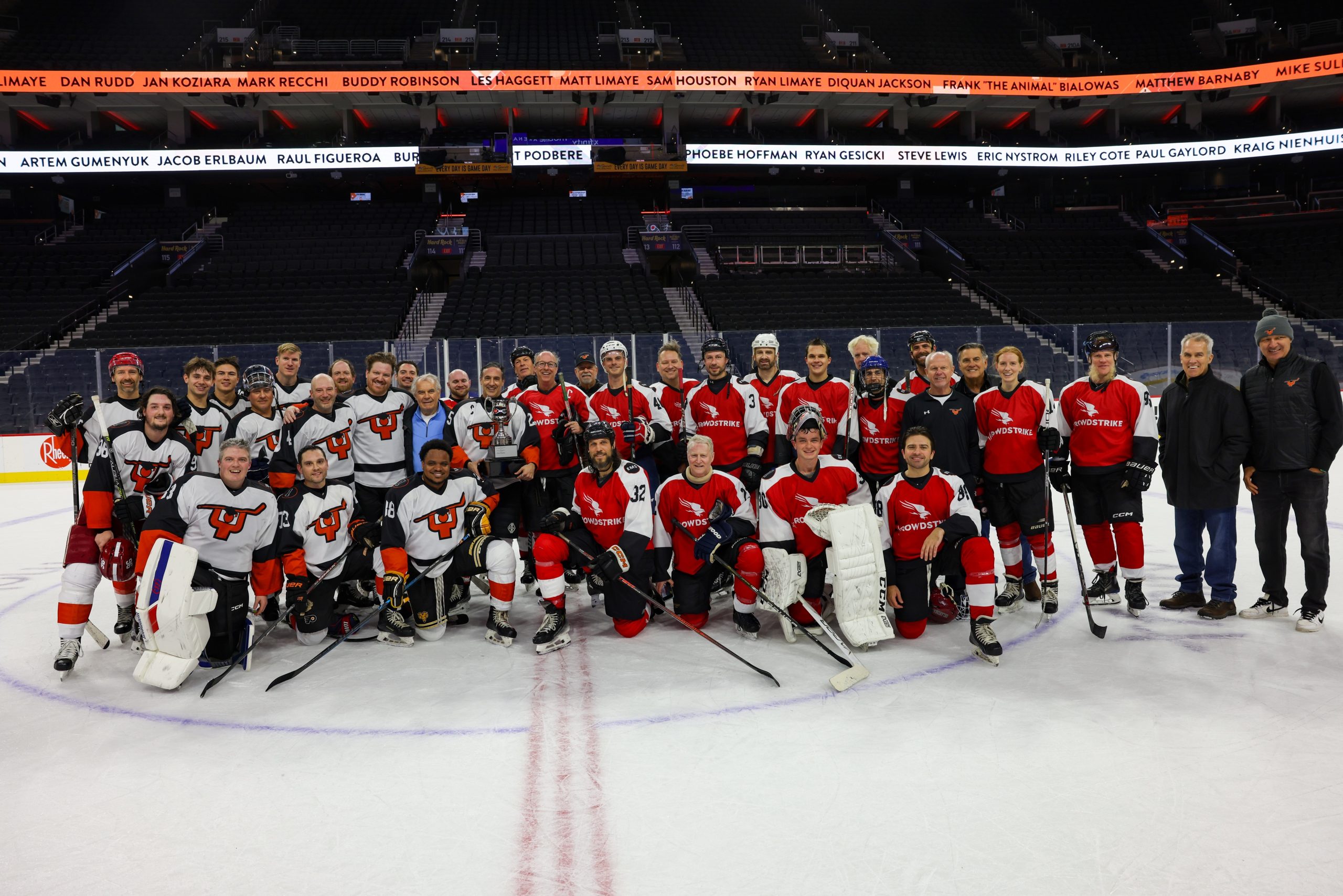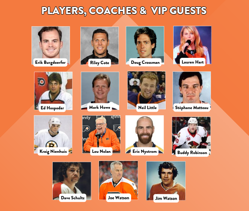 Our competitors were divided into two teams, Team Snider and Team CrowdStrike, with both teams looking for a win after the game ended in a tie last year! Former Flyer and Stanley Cup champion Dave “The Hammer” Schultz signed copies of his new book, “Hammered” for all of our attendees. Former Flyer Ed Hospodar once again volunteered to referee the game. Thank you to the following individuals, who served as players, coached, and VIP guests at the event:
